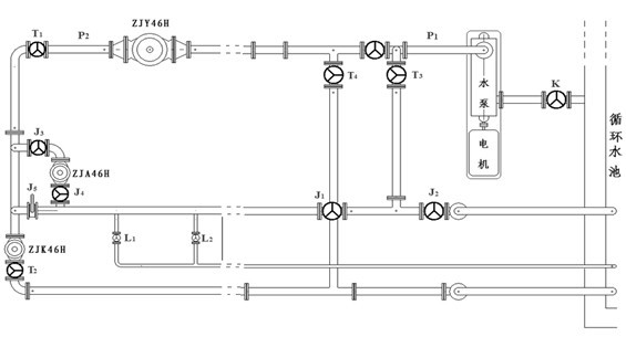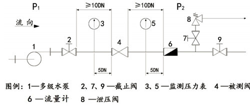 如圖所示:4位置活塞式減壓閥, 分別為ZJY46H-25C DN450活塞式減壓閥;壓力表(P1、P2)精度為0.4級,并具有穩(wěn)流管和旋塞調節(jié)閥;測流流量計為電磁式或超聲波式均可,安裝于被測閥4后的規(guī)定位置。