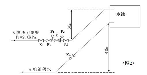 如圖2所示:在壓力鋼管進機組處的位置附近取水。K1、K2分別這取水閥和工作閥,Y為ZJY46H-40C DN150減壓閥。P2的壓力整定為0.6MPa,減壓后的水直供水池,再由水池供兩臺機組用水。調節(jié)閥門K3為合適的過流面積。改進前的單臺ZJY46H-40C DN150減壓閥的流量在滿足兩臺機組運行時,運行噪音為118dB。