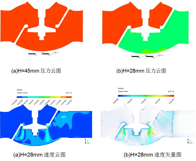 分別試算H= 45mm、35mm、30mm、29mm、28mm、27mm六種閥芯開度并比較計算結果,得出在H=28mm時,ZJY46H活塞式減壓閥出口壓力約為0.6MPa,因此適于給定的水電站技術供水系統(tǒng)的ZJY46H活塞式減壓閥的開度應為28mm。