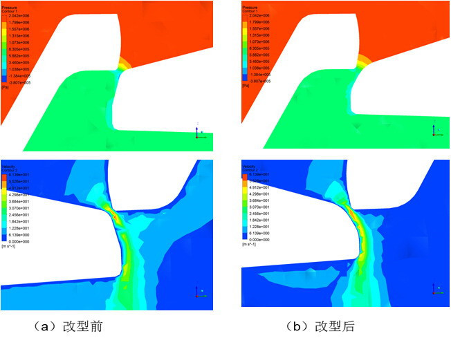 改型前后閥芯與閥座上流區(qū)域壓力云圖和下流區(qū)域速度云圖