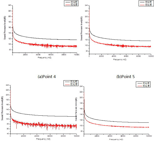 優(yōu)化前后的減壓閥有相同趨勢的聲壓級圖,優(yōu)化節(jié)流錐型線后的減壓閥聲壓級平均下降了20dB以上,并且優(yōu)化后的減壓閥聲壓級脈動性較未優(yōu)化明顯,達到一定的減噪要求。