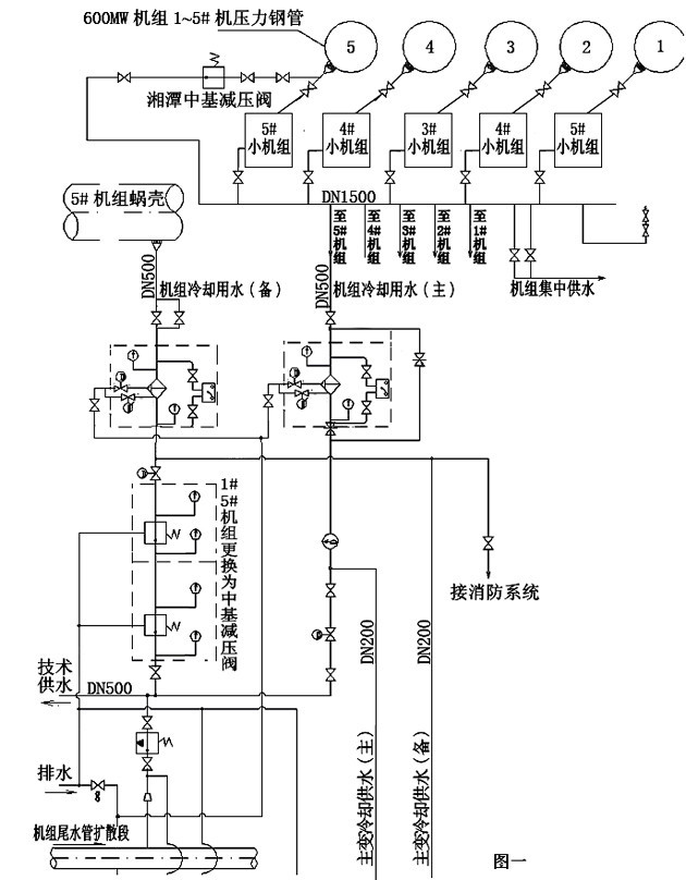 3.1機組技術供水系統(tǒng)(如下圖一所示)設計采用技術供水水源機組(小機)集中供水和單機單元自流減壓供水的混合供水方式,其中一路是采用5臺水源機組發(fā)電減壓后的尾水集中匯流至匯流母管,從匯流母管上分別引出5路供水作為600MW機組的技術供水主用水源,另一路采用600MW機組鋼管取水通過自流減壓后作為600MW機組的技術供水備用水源。