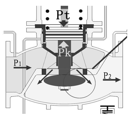 當P1上升時,減壓閥的P2+ΔP2首先表現(xiàn)為上升,其值通過反饋系統(tǒng)出口管傳到控制閥,使Pt′+ΔPt′,ΔPt′與Pk′的力達到新的平衡,控制閥h減小;相應ΔPk′壓力增大,經(jīng)壓力導管,使主閥的Pk+ΔPk,Pt=Pk+ΔPk壓力達到新的平衡,主閥h減小、ΔP2值恢復為原P2值。當進口壓力P1下降時,主閥與控制閥的工況則與上述的工況相反。
